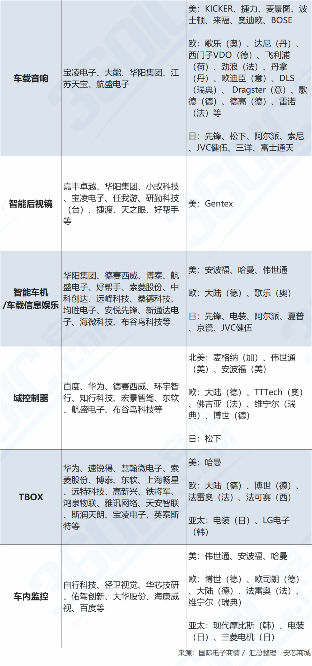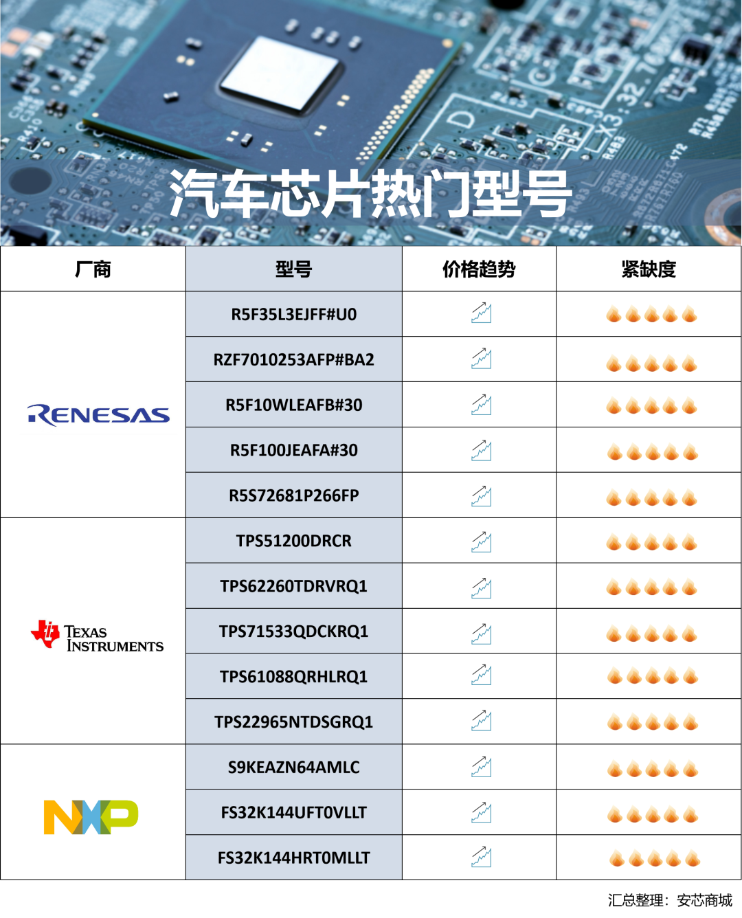 因此,安芯商城整理了一份汽車芯片產(chǎn)業(yè)鏈廠商匯總及近期熱門型號(hào)數(shù)據(jù),供伙伴們參考。