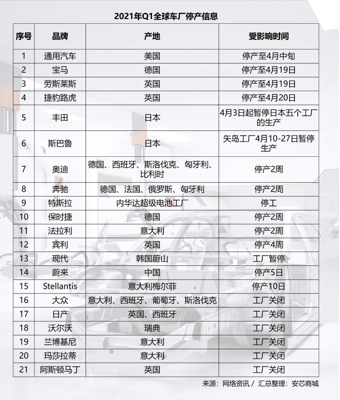 附表2:2021年Q1全球車企停產(chǎn)情況