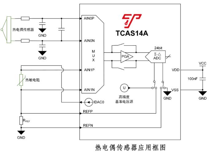 2. 熱電偶傳感器:熱電偶傳感器應用框圖所示是一個基于24bit Σ-△ADC的熱電偶測量系統(tǒng)。TCAS內置PGA、24bit Σ-△ADC、基準電壓源VDAC和激勵電流IDAC等。芯片內部集成的偏置電壓發(fā)生器偏置熱電偶信號,確保輸入信號滿足輸入電壓限值的要求。片內提供1mA的激勵電流用于為熱敏電阻和采樣電阻供電?;鶞孰妷豪迷撏獠坎蓸与娮璁a生。