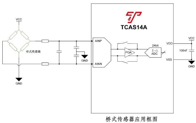 1. 橋式傳感器:橋式傳感器應用框圖所示是一個基于低噪聲PGA、24bit Σ-△ADC等的高精度橋式傳感器測量系統(tǒng)。TCAS內置2級具有可調增益的低噪聲PGA,以及低均方根(RMS)噪聲的24bit Σ-△ADC和溫度補償電路,可以直接測量來自橋式傳感器等的小信號。