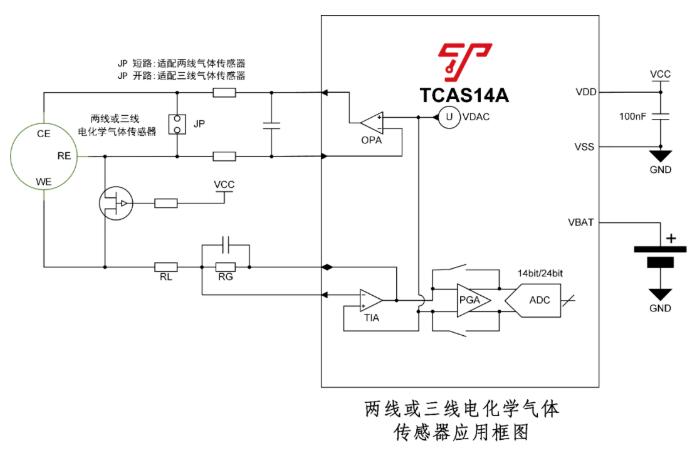 3. 電化學氣體傳感器:電化學氣體傳感器應用框圖是一個基于24bit Σ-△ADC或14bit SAR ADC的電流型電化學氣體傳感器系統(tǒng)。TCAS內置運放OPA、跨阻放大器TIA、24bit Σ-△ADC或14bit SAR ADC、VDAC等。通過傳感器參考電極(RE)向OPA提供反饋,從而改變反電極(CE)上的電壓來保持WE引腳的恒定電位。內部TIA將傳感器的電流信號轉變?yōu)殡妷盒盘枺峁┙oADC。內部VDAC為TIA提供偏置電壓,使得信號處于ADC支持的電壓范圍內,以便為不同類型的傳感器提供充足裕量。