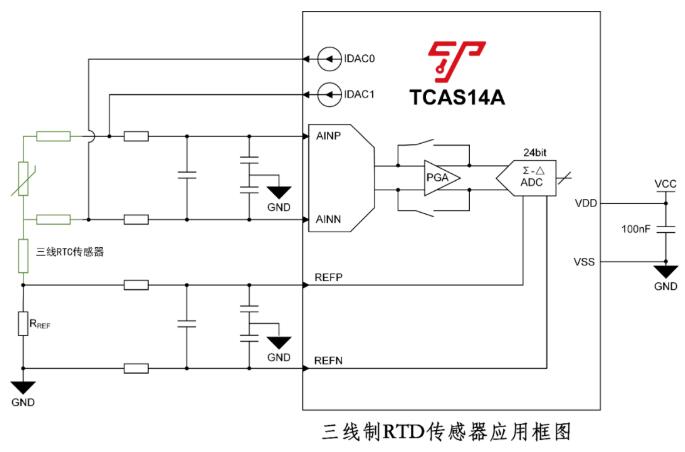 4. 三線制RTD傳感器:三線制RTD傳感器應用框圖是一個基于24bit Σ-△ADC的具有外部參考的比例型三線制RTD(Resistance Temperature Detector)傳感器測量系統(tǒng)。該方案在很大程度上消除了傳感器引線對測量結果的影響,可進行高精度的測量。