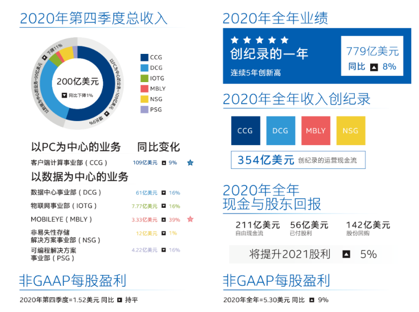 英特爾的2020年第四季度和全年的財(cái)報(bào)1月22日已公布。據(jù)報(bào)告顯示,該公司的第四季度營(yíng)收為199.78億美元。2020年財(cái)年?duì)I收為779億美元,與2019財(cái)年的720億美元相比增長(zhǎng)8%;凈利潤(rùn)為209億美元,連續(xù)5年創(chuàng)下營(yíng)收新高。