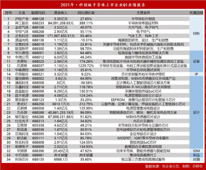 其中,眾多半導體企業(yè)Q1表現(xiàn)亮眼。截至5月5日,共有33家科創(chuàng)板半導體企業(yè)公布了2021年一季度業(yè)績。恒玄科技、晶豐明源以及神工股份歸母凈利潤同比增長超1000%,芯源微實現(xiàn)營業(yè)收入同比上漲超1000%。