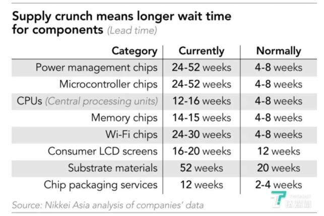 據(jù)日經(jīng)新聞報道,受全球芯片短缺影響,功率IC、MCU(即微控制器)的交貨期為24周一一52周(一年的時間)。CPU需要12周一一16周,存儲半導(dǎo)體需要14周一一15周,Wi-Fi(通信半導(dǎo)體等)需要24周一一30周等。此外,液晶顯示屏(LCD)、基板材料、封裝服務(wù)等的交貨期也都在加長。晶圓以及后段工序的印刷線路板等基板材料的正常交貨期是12周,而如今的交貨期最長達(dá)到52周,即一年。