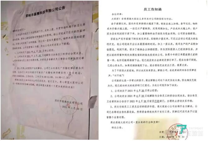 其中一家位于深圳的“基德科技”在公告中稱:由于成本壓力增加、行業(yè)利潤下滑、外貿(mào)市場惡化和新冠疫情的多方影響,該公司遭受巨大的負(fù)面沖擊,一直負(fù)重前行。盡管采取了各種措施,始終未能扭轉(zhuǎn)經(jīng)營困境、經(jīng)營難以為繼,公司決定自2021年4月29日停止經(jīng)營,4月30日起解雇傭全體員工。
