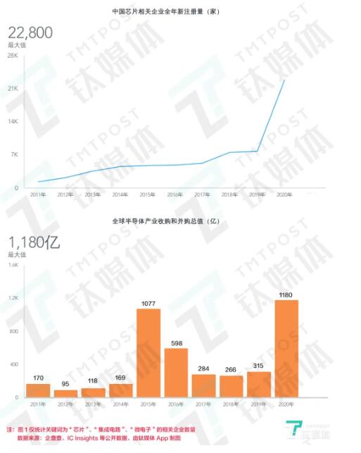 中國芯片相關(guān)企業(yè)全年新增注冊量和全球半導(dǎo)體產(chǎn)業(yè)收并購總值