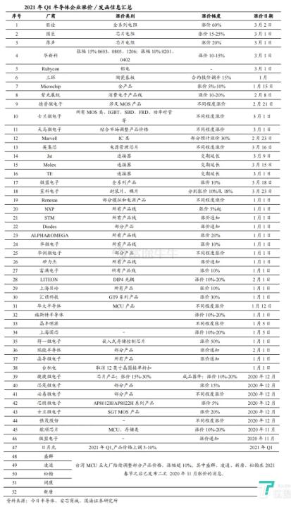 2021年Q1部分芯片廠商漲價信息(圖片來源:國海證券研報 via富途牛牛)
