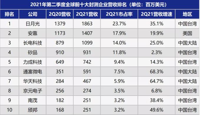 據(jù)TrendForce公布的報(bào)告,2021年Q2季度,全球封測(cè)市場(chǎng)規(guī)模排名前十的廠商中,有6家來(lái)自于中國(guó)臺(tái)灣,合計(jì)市場(chǎng)份額占比54.8%;3家來(lái)自中國(guó)大陸,合計(jì)市場(chǎng)份額占比27.4%;僅有安靠一家來(lái)自美國(guó),市場(chǎng)份額占比17.9%。