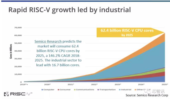 根據Semico Research預測,到2025年,RISC-V CPU內核的出貨量將達到624億個,2018-2025年復合年增長率高達146.2%。其中在工業(yè)領域將以167億個核心的出貨量居于領先位置。