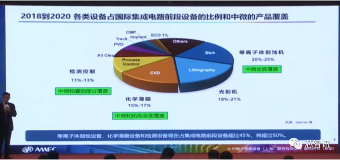 根據(jù)中微半導(dǎo)體公布的數(shù)據(jù)顯示,2018到2020年,等離子刻蝕設(shè)備、化學(xué)薄膜沉積設(shè)備和檢測(cè)設(shè)備在集成電路前段設(shè)備當(dāng)中的總體產(chǎn)比已經(jīng)超過(guò)45%,并且將超過(guò)50%。其中,等離子刻蝕機(jī)占比20-25%,在該領(lǐng)域中微半導(dǎo)體的產(chǎn)品已經(jīng)實(shí)現(xiàn)了全面覆蓋;化學(xué)薄膜沉積設(shè)備占比15-17%,在該領(lǐng)域中微半導(dǎo)體和拓荊科技也已實(shí)現(xiàn)全面覆蓋;檢測(cè)設(shè)備市場(chǎng)占比11-13%,在該領(lǐng)域中微半導(dǎo)體和睿勵(lì)科學(xué)儀器實(shí)現(xiàn)了部分覆蓋。