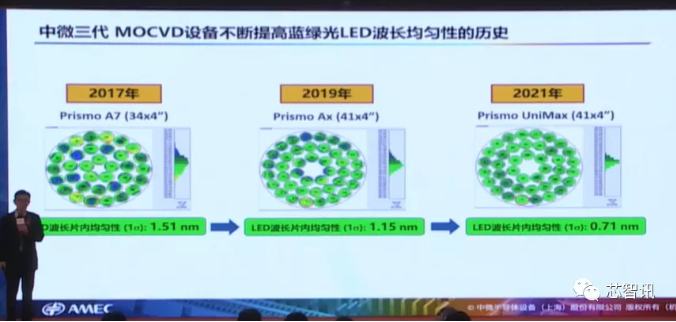 據(jù)尹志堯介紹,2017年到2021年,中微半導(dǎo)體的MOCVD設(shè)備也在不斷進(jìn)行了改進(jìn)和提高,藍(lán)綠光LED波長(zhǎng)均勻性,已經(jīng)成功從波長(zhǎng)1.57nm做到了0.7nm左右。