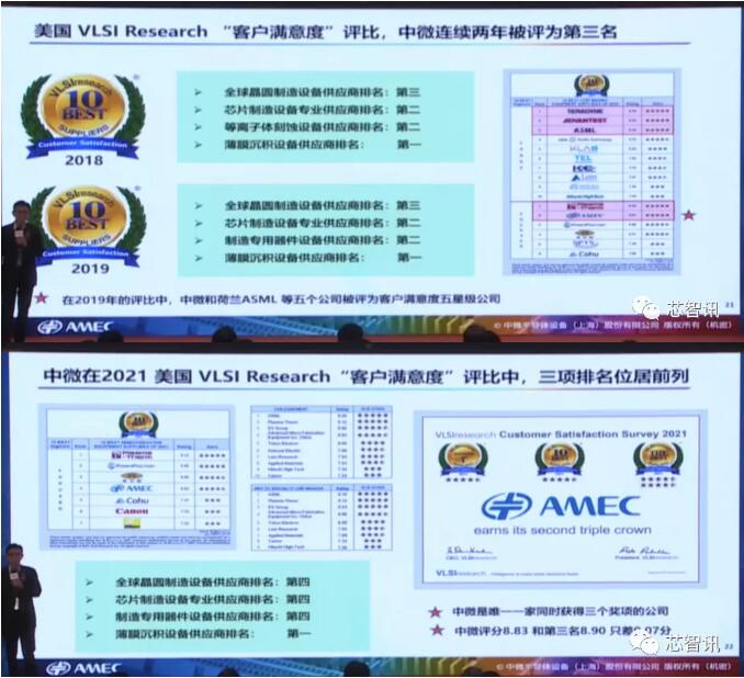 憑借出色的產(chǎn)品競(jìng)爭(zhēng)力,中微的半導(dǎo)體設(shè)備獲得了眾多國(guó)內(nèi)外客戶的廣泛認(rèn)可。在2018年-2019年美國(guó)VLSI Reaseach全球半導(dǎo)體設(shè)備公司產(chǎn)品客戶滿意度評(píng)比中,中微半導(dǎo)體的是評(píng)比中,中微連續(xù)兩年獲得全球第三名。在2021年的客戶滿意度評(píng)比中,中微也有三項(xiàng)排名位居前列。