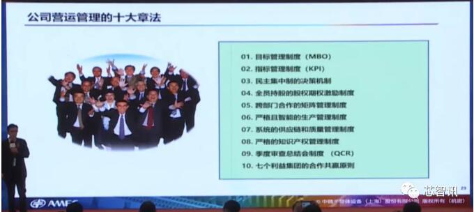 在公司的營(yíng)運(yùn)管理方面,中微半導(dǎo)體提出十大章法。包括目標(biāo)管理制度(MBO),有360度的評(píng)價(jià)機(jī)制;指標(biāo)管理制度(KPI);民主集中制的決策機(jī)制;全員持股的股權(quán)期權(quán)激勵(lì)制度;跨部門(mén)合作的矩陣管理制度;嚴(yán)格且智能的生產(chǎn)管理制度;系統(tǒng)的供應(yīng)鏈和質(zhì)量管理制度;嚴(yán)格的知識(shí)產(chǎn)權(quán)管理制度;季度審查總結(jié)會(huì)制度(QCR)和七個(gè)利用集團(tuán)的合作共贏機(jī)制。