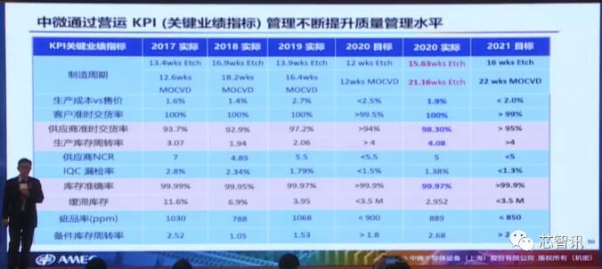 比如在準(zhǔn)時(shí)送出設(shè)備的時(shí)間上,按時(shí)運(yùn)輸比例中微一般可以保持在100%;還有每一個(gè)設(shè)備運(yùn)出的缺陷,包括軟件缺陷,在國(guó)際上一般都是5-7個(gè)左右,中微現(xiàn)在可以做到2-3個(gè),通過(guò)KPI管理可以改進(jìn)公司的運(yùn)轉(zhuǎn)。