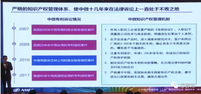 即使中微半導(dǎo)體在知識(shí)產(chǎn)權(quán)上做的很到位,在過(guò)去十幾年還是受到了美國(guó)三個(gè)設(shè)備公司四次專利官司。其中三次是被美國(guó)設(shè)備公司起訴,一次是中微半導(dǎo)體起訴美國(guó)設(shè)備公司。其中兩個(gè)是中微獲勝,兩個(gè)是雙方達(dá)成和解。