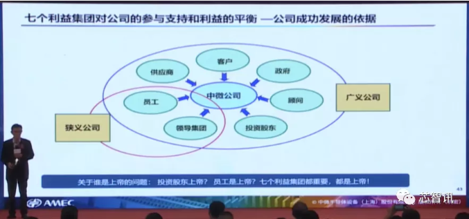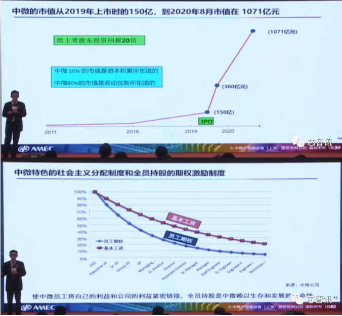 “現(xiàn)在很多半導(dǎo)體公司都是經(jīng)過(guò)一輪一輪融資起來(lái)的,資本進(jìn)入公司肯定有價(jià)值的。但是公司價(jià)值不僅僅是資本創(chuàng)造的,特別是科創(chuàng)企業(yè),主要是靠勞動(dòng)創(chuàng)新創(chuàng)造的價(jià)值。但是,如果勞動(dòng)創(chuàng)造的價(jià)值全都被資本分走了,這個(gè)就叫資本主義。而我們是社會(huì)主義,要解決剩余價(jià)值的合理分配問(wèn)題。所以,我們中微是全員持股,并且提出概念是這樣的,管理層也好,員工也好,拿到公司股票不需要拿錢(qián)的,只要有勞動(dòng)創(chuàng)造,經(jīng)過(guò)一定評(píng)價(jià)機(jī)制可以拿到公司股票。另外上市以后把股票減持,應(yīng)該算勞動(dòng)資本投資,應(yīng)該是20%的資本利得稅,而不是45%所得稅。這樣分給員工股票期權(quán),實(shí)際上已經(jīng)創(chuàng)造出來(lái)了工作價(jià)值。如果公司價(jià)值不增長(zhǎng)的話,當(dāng)然不能亂發(fā)股票。”