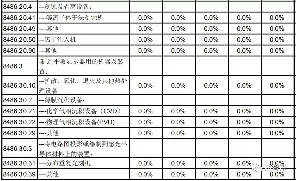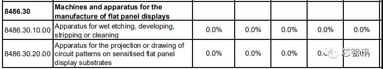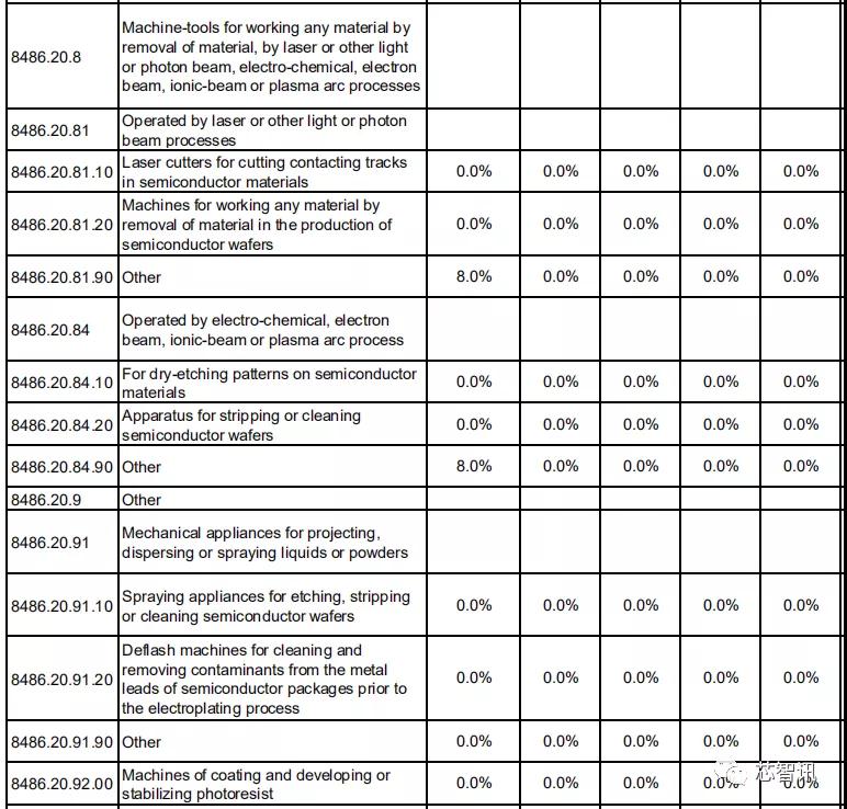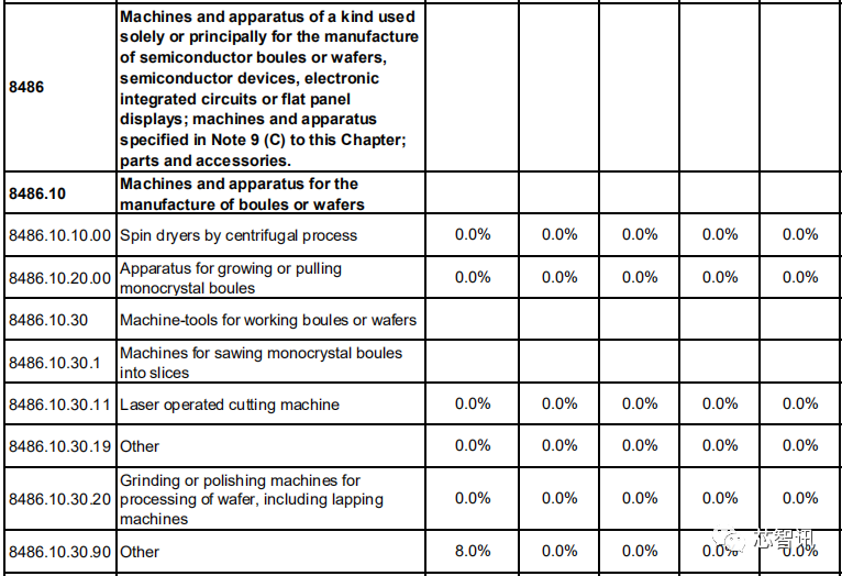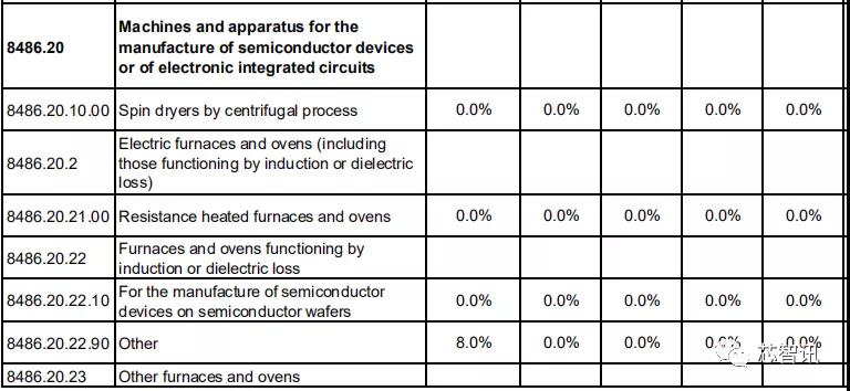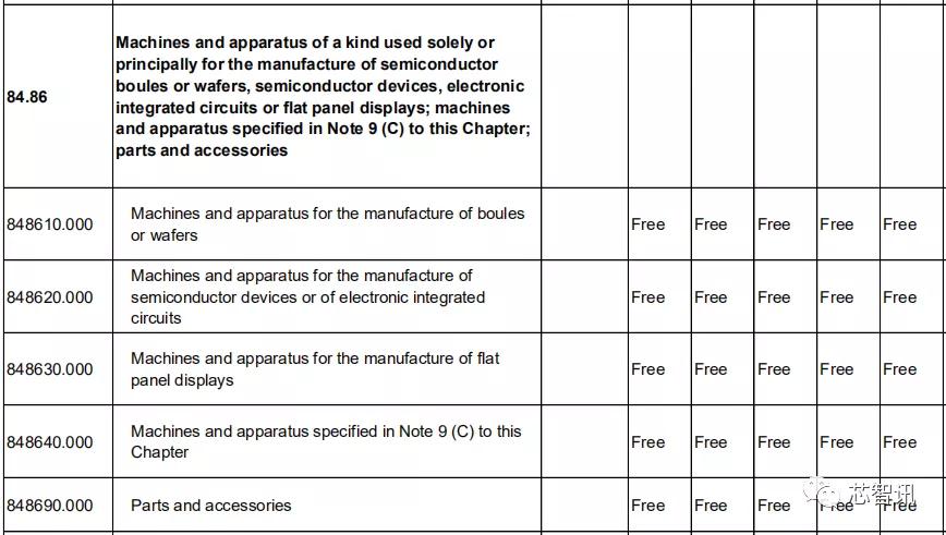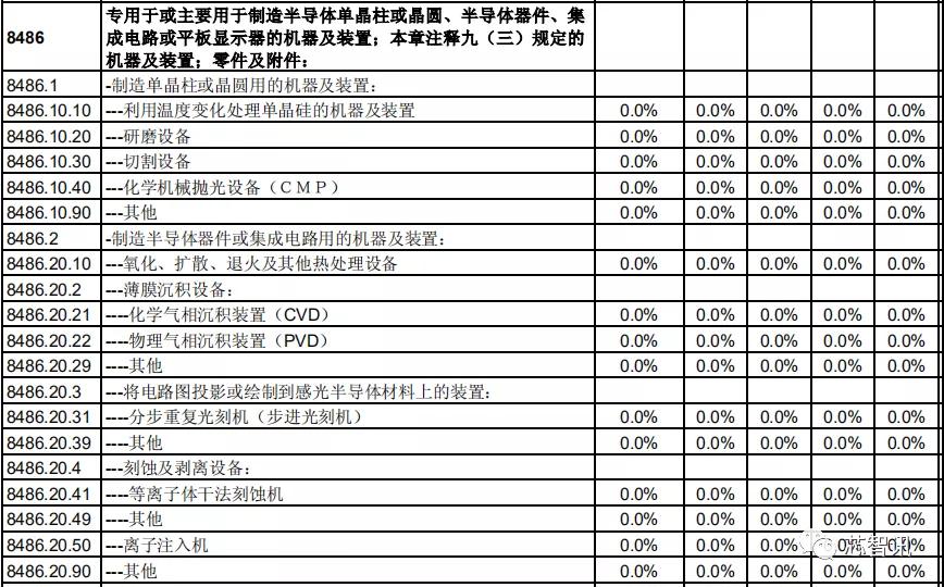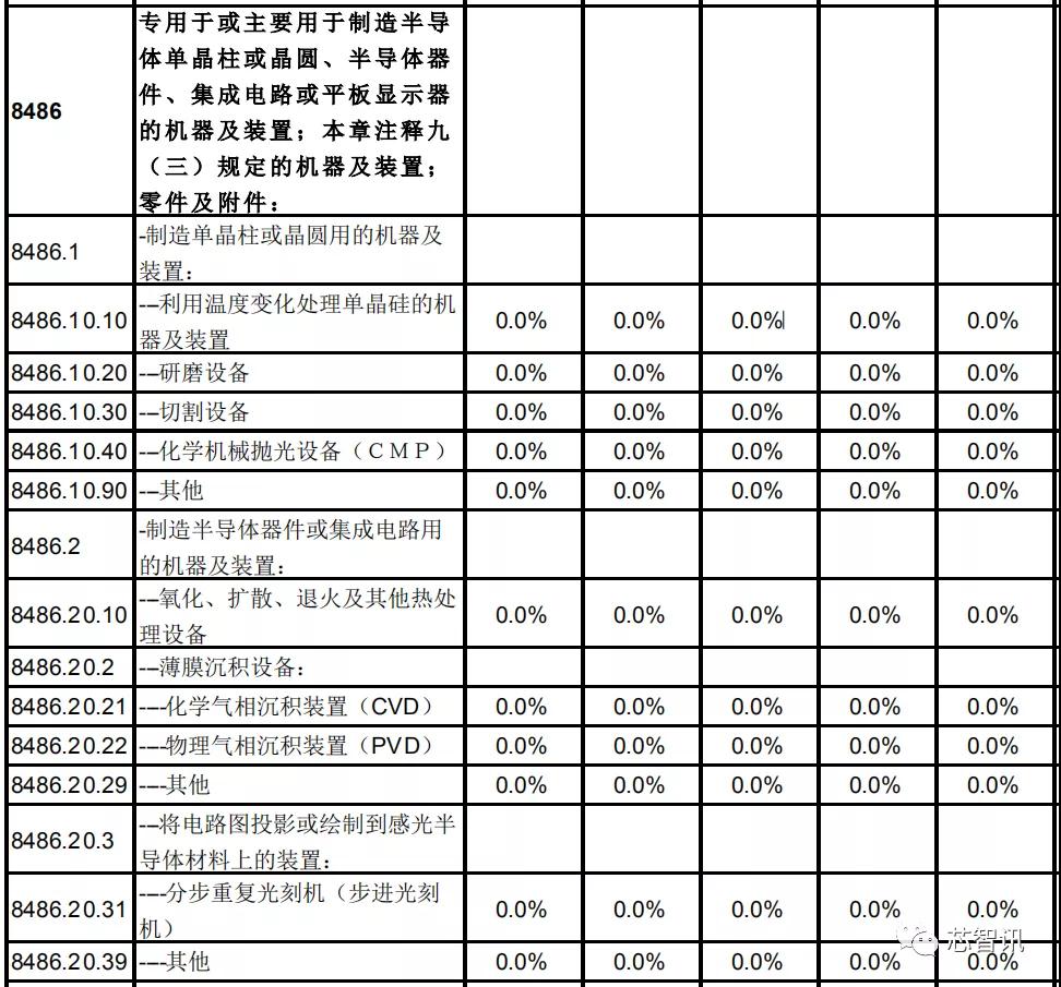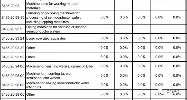 對于專用于或主要用于制造半導體單晶柱或晶圓、半導體器件、集成電路或平板顯示器的機器及裝置,比如研磨、切割、CMP、氧化、擴散、退火、CVD、PVD、光刻機、離子注入、刻蝕及剝離等眾多半導體設(shè)備,中國對日本的關(guān)稅均為0。