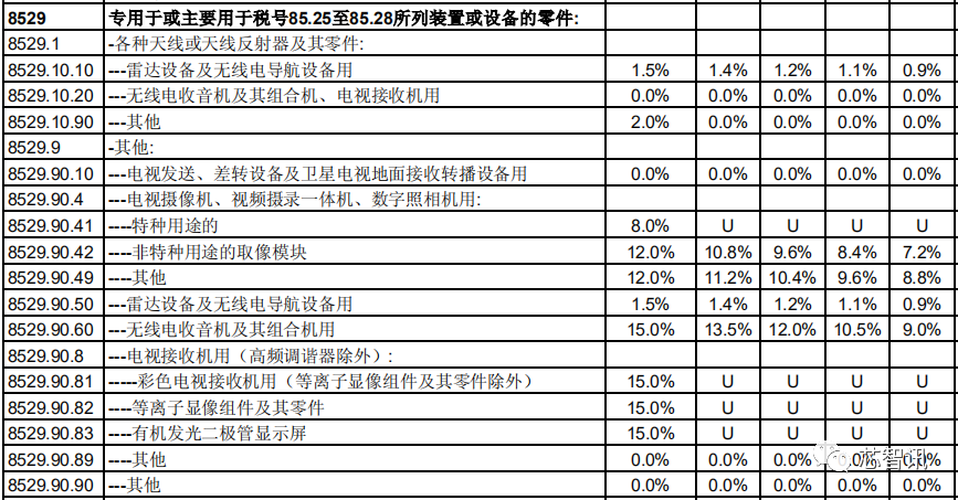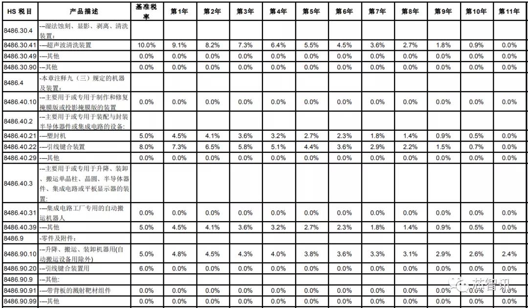 對于專用于或主要用于制造半導體單晶柱或晶圓、半導體器件、集成電路或平板顯示器的機器及裝置所需的相關(guān)零件和附件方面:升降、搬運、裝卸機器用(自動搬運設(shè)備用除外)的零件和附件的基準稅率為5%,第1年將降至4.8%,隨后逐年遞減0.2個百分點;引線鍵合裝置用的零件和附件的基準稅率為6%,第1年將直接降至0。