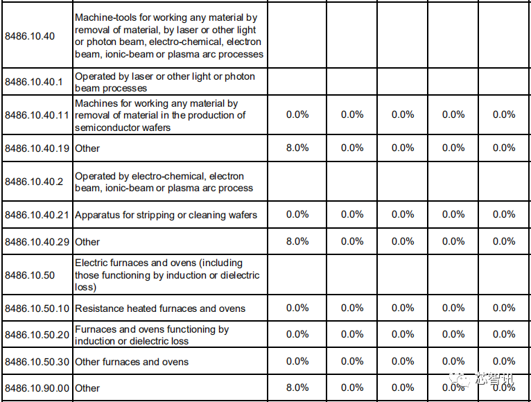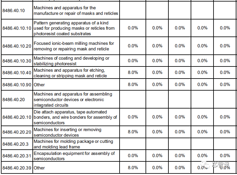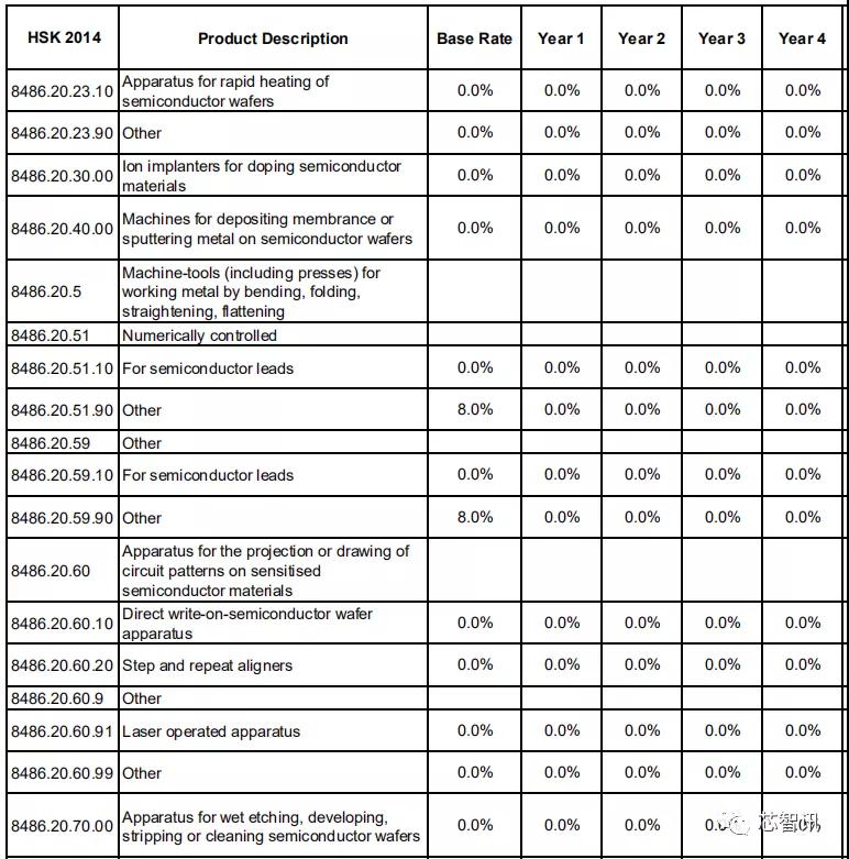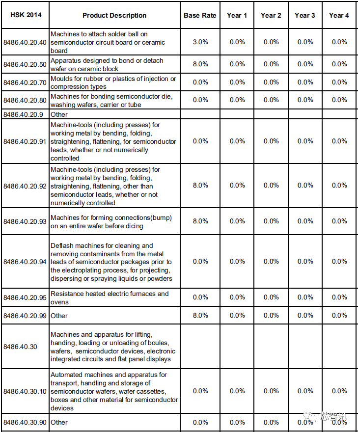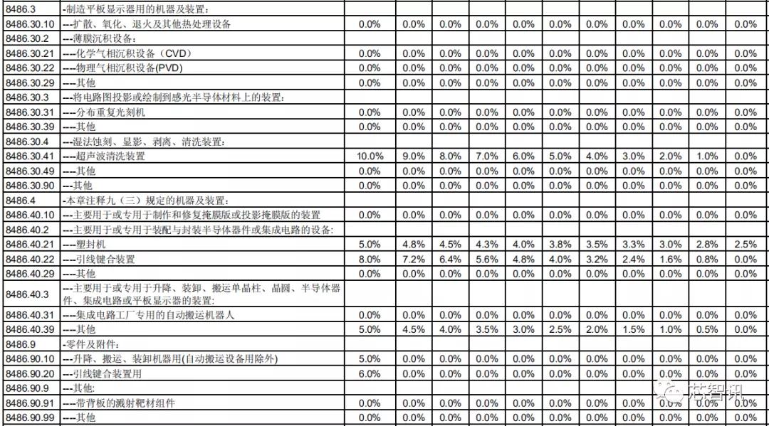 對于主要用于制作和修復掩膜版的設(shè)備,以及裝配與封裝半導體器件或集成電路的設(shè)備,雖然有部分設(shè)備的基準稅率為3%-8%,但是第1年均將直接降至0。