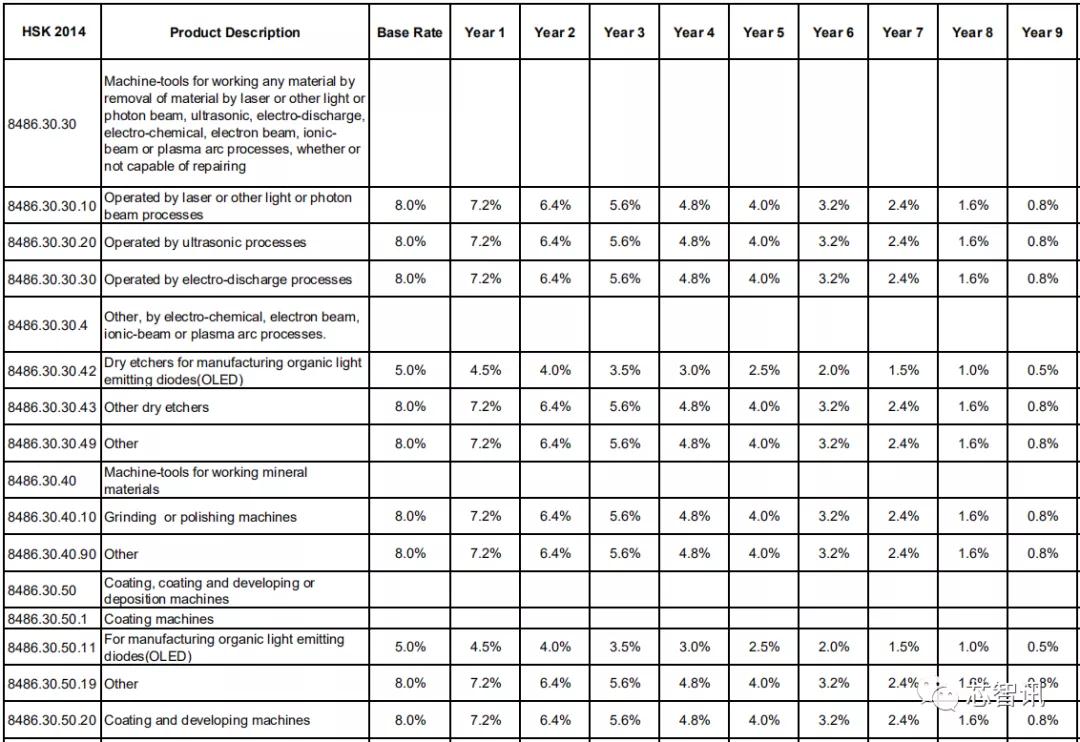 而在基于電化學、電子束、離子束或等離子弧工藝的去除材料來加工任何材料的設(shè)備當中,用于制造有機發(fā)光二極管(OLED)的干式蝕刻機的基準稅率為5%,第1年降至4.5%,此后逐年降低0.5個百分點,直至第10年降至0;其他干式蝕刻機及其他設(shè)備的基準稅率均為8%,第1年都將降至7.2%,此后逐年降低0.8個百分點,直至第10年降至0。