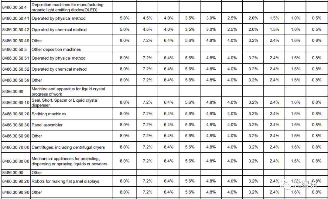 對于各類液晶面板加工設(shè)備,基準稅率基本都為8%,第1年將降至7.2%,此后逐年降低0.8個百分點,直至第10年降為0。