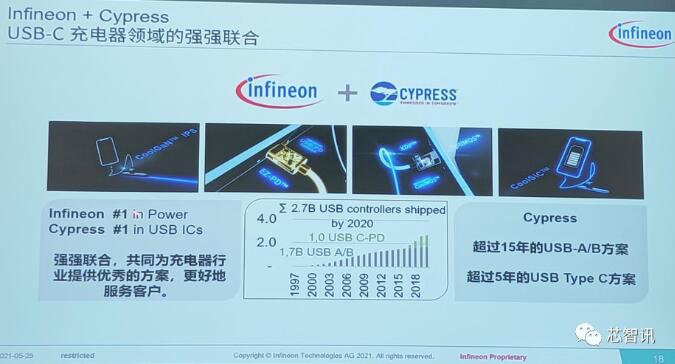 根據(jù)英飛凌公布的數(shù)據(jù)顯示,旗下的賽普拉斯擁有超過15年的USB方案經(jīng)驗(yàn)以及5年的USB Type-C方案經(jīng)驗(yàn),是全球[敏感詞]大USB控制芯片供應(yīng)商。截至2020年,賽普拉斯已累計(jì)出貨27億顆USB控制器芯片。其中,在近幾年興起的USB Type-C市場,賽普拉斯也已累計(jì)出貨了超過10億顆USB Type-C控制器。
