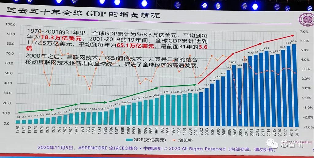 從上圖的數(shù)據(jù)當(dāng)中,我們可以看到,1970-2001的31年里,全球GDP累計(jì)為568.3萬(wàn)億美元,平均每年為18.3萬(wàn)億美元。而2001-2019的19年間,全球GDP累計(jì)達(dá)到1172.5萬(wàn)億美元,平均到每年為65.1萬(wàn)億美元,是前面31年的3.6倍。