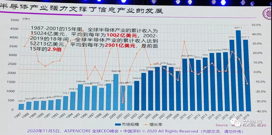 根據(jù)歷史數(shù)據(jù)顯示,從1987年到2001年的15年里,全球半導(dǎo)體產(chǎn)業(yè)的累計(jì)收入為15024億美元,平均到每年為1002億美元。2002-2019的18年間,全球半導(dǎo)體產(chǎn)業(yè)的累計(jì)收入達(dá)到52213億美元,平均到每年為2901億美元,是前面15年的2.9倍,與前面GDP增長(zhǎng)的倍數(shù)相近,呈強(qiáng)相關(guān)性。