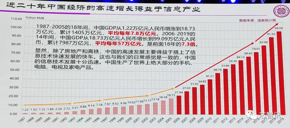 根據(jù)統(tǒng)計(jì)數(shù)據(jù)顯示,1987- 2005的18年間,中國(guó)GDP從1.22萬(wàn)億元人民幣增長(zhǎng)到18.73萬(wàn)億元,累計(jì)1405萬(wàn)億元,平均每年7.8萬(wàn)億元。2006- 2019的14年間, 中國(guó)GDP從18.73萬(wàn)億元人民幣增長(zhǎng)到99.09萬(wàn)億元人民幣,累計(jì)7987萬(wàn)億元,平均每年57萬(wàn)億元,是前面18年的7.3倍。如果把這當(dāng)中房地產(chǎn)、高鐵基建等因素去掉,信息產(chǎn)業(yè)貢獻(xiàn)的大概也是在3倍多。所以這樣的一個(gè)數(shù)字就證明了,信息產(chǎn)業(yè)是中國(guó)近20年經(jīng)濟(jì)發(fā)展的根本動(dòng)力之一。這也與我們的日常感覺(jué)是一致的,中國(guó)的信息技術(shù)發(fā)展十分迅速。中國(guó)生產(chǎn)了世界上絕大部分的手機(jī)、電腦、電視及家電產(chǎn)品。