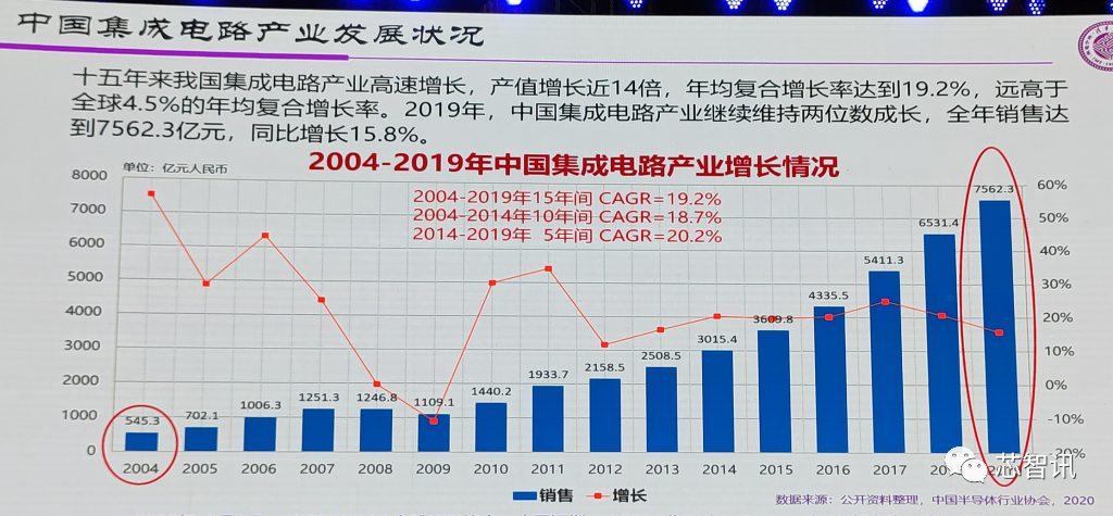 根據(jù)數(shù)據(jù)顯示,2004-2019年這十五年來(lái),中國(guó)集成電路產(chǎn)業(yè)高速增長(zhǎng),產(chǎn)值增長(zhǎng)近14倍,年均復(fù)合增長(zhǎng)率高達(dá)19.2%,遠(yuǎn)高于全球4.5%的年均復(fù)合增長(zhǎng)率。2019年,中國(guó)集成電路產(chǎn)業(yè)繼續(xù)維持兩位數(shù)成長(zhǎng),全年銷(xiāo)售達(dá)到7562.3億元,同比增長(zhǎng)15.8%。