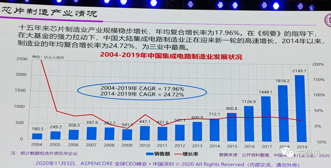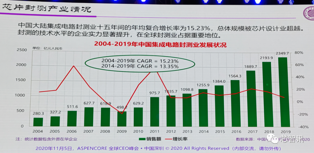 魏少軍教授表示:“芯片制造業(yè)近年來(lái)的增長(zhǎng)主要是依靠政府和產(chǎn)業(yè)資本的投資,而封測(cè)業(yè)曾經(jīng)長(zhǎng)期占用我們的絕大部分的江山,但是現(xiàn)在它的比例在下降,而且增速也不高,從2014到2019年,增速在下降,并沒(méi)有提升。所以這是值得我們關(guān)注的現(xiàn)象,說(shuō)明我們?cè)谶@個(gè)領(lǐng)域的投入是不足的。”