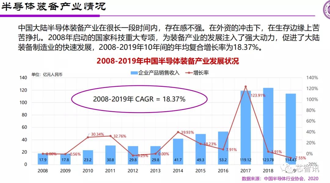 另外,在芯片制造上游的半導(dǎo)體裝備產(chǎn)業(yè)方面,中國(guó)大陸半導(dǎo)體裝備產(chǎn)業(yè)在很長(zhǎng)一段時(shí)間內(nèi), 存在感不強(qiáng)。在外資的沖擊下,在生存邊緣上苦苦掙扎。2008年啟動(dòng)的國(guó)家科技重大專(zhuān)項(xiàng),為裝備產(chǎn)業(yè)的發(fā)展注入了強(qiáng)大動(dòng)力,再加上近幾年的國(guó)家大基金的支持以及科創(chuàng)板的推出,促進(jìn)了大陸半導(dǎo)體裝備業(yè)的快速發(fā)展,2008-2019年10年間的年均復(fù)合增長(zhǎng)率為18.37%??梢悦黠@的看到2017年的增長(zhǎng)高達(dá)123.91%。