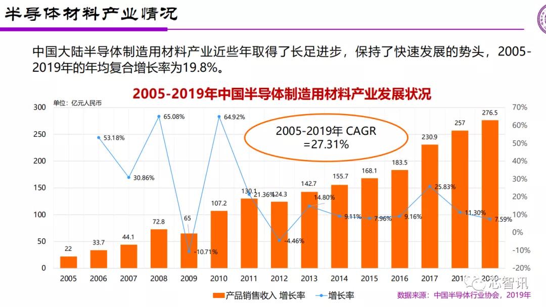 在半導(dǎo)體制造所需的半導(dǎo)體材料產(chǎn)業(yè)上,近些年中國(guó)大陸也取得了長(zhǎng)足進(jìn)步,保持了快速發(fā)展的勢(shì)頭,2005-2019年的年均復(fù)合增長(zhǎng)率為19.8%。但是相比半導(dǎo)體制造產(chǎn)業(yè)的24.72%的年復(fù)合增長(zhǎng)率來(lái)說(shuō),還是偏低的。