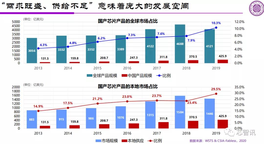 從供需情況來(lái)看,中國(guó)對(duì)于半導(dǎo)體芯片的需求是非常旺盛的,但國(guó)產(chǎn)芯片的供給嚴(yán)重不足。雖然我們芯片設(shè)計(jì)業(yè)已經(jīng)越來(lái)越壯大,但是我們的芯片制造還很薄弱,我們的IDM很少,因此我們的國(guó)產(chǎn)芯片在全球芯片市場(chǎng)的占比(按價(jià)值計(jì)算)僅為10.3%。而在中國(guó)大陸市場(chǎng),我們所用的1400多億美元的芯片當(dāng)中,國(guó)產(chǎn)芯片的占比僅為29%左右。如果不按價(jià)值計(jì)算,比例可能更低。