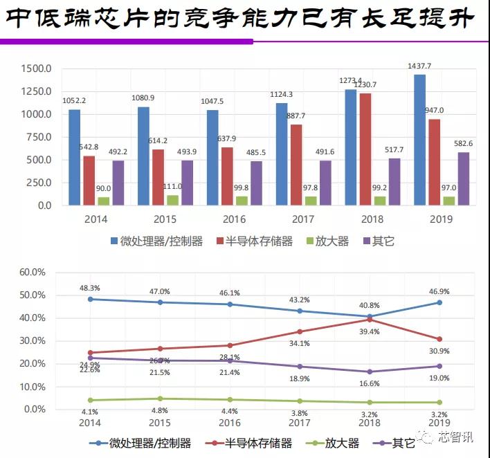 從上面的數(shù)據(jù)我們可以看到,在放大器和其他半導(dǎo)體芯片上,過(guò)去五年來(lái)增長(zhǎng)都不大,這也說(shuō)明我們?cè)谥械投说漠a(chǎn)品上,整體替代性比較強(qiáng),但是在高端芯片,特別微處理器和存儲(chǔ)器上還有比較大的差距,因?yàn)橥谠鲩L(zhǎng)在40%以上。當(dāng)然這里需要指出的是,不少微處理器是在國(guó)內(nèi)設(shè)計(jì)的,但是很多依然是交由大陸以外的晶圓廠(chǎng)制造,這也是推動(dòng)進(jìn)口中高端芯片快速增長(zhǎng)的一個(gè)因素。