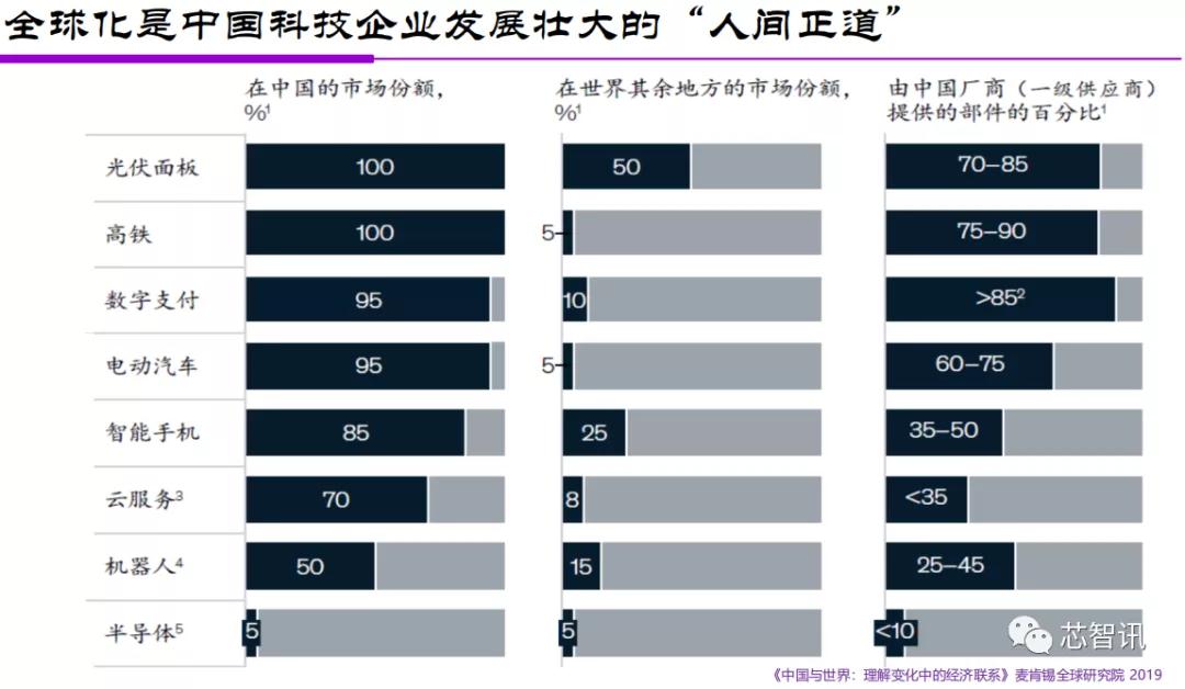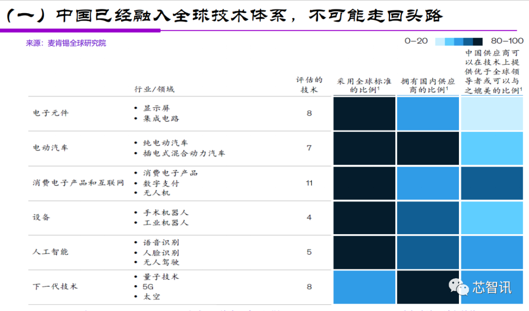 根據(jù)麥肯錫全球研究院的一組研究數(shù)據(jù)顯示,在例如電子元件、電動(dòng)汽車(chē)、消費(fèi)電子及互聯(lián)網(wǎng)、機(jī)器人設(shè)備、人工智能、下一代技術(shù)等眾多關(guān)鍵技術(shù)方面,中國(guó)對(duì)外的依存度依舊很高。從下圖當(dāng)中,我們可以看到,在眾多技術(shù)方面,中國(guó)采用全球標(biāo)準(zhǔn)的比例非常的高,雖然擁有國(guó)內(nèi)供應(yīng)商的比例也相對(duì)較高,但是中國(guó)供應(yīng)商可以在技術(shù)上提供全球領(lǐng)導(dǎo)者或可以與之媲美的比例卻非常低。這也意味著,很多技術(shù)的創(chuàng)新的源頭并不在中國(guó),中國(guó)需要繼續(xù)與全球進(jìn)行技術(shù)交流。