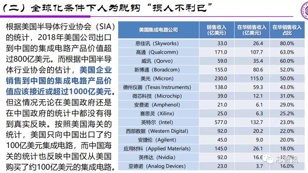 根據(jù)美國(guó)半導(dǎo)體行業(yè)協(xié)會(huì)公布的數(shù)據(jù)顯示,2018年美國(guó)半導(dǎo)體企業(yè)在中國(guó)的銷(xiāo)售的集成電路產(chǎn)品價(jià)值超過(guò)了1000億美元,在中國(guó)的銷(xiāo)售收入在很多美國(guó)企業(yè)的營(yíng)收當(dāng)中占據(jù)了半壁江山。顯然,在中美科技脫鉤的情況下,美國(guó)半導(dǎo)體企業(yè)并不能從中獲益。因此,美國(guó)半導(dǎo)體行業(yè)協(xié)會(huì)以及美國(guó)很多的半導(dǎo)體企業(yè)也反對(duì)美國(guó)政府與中國(guó)脫鉤的舉措。