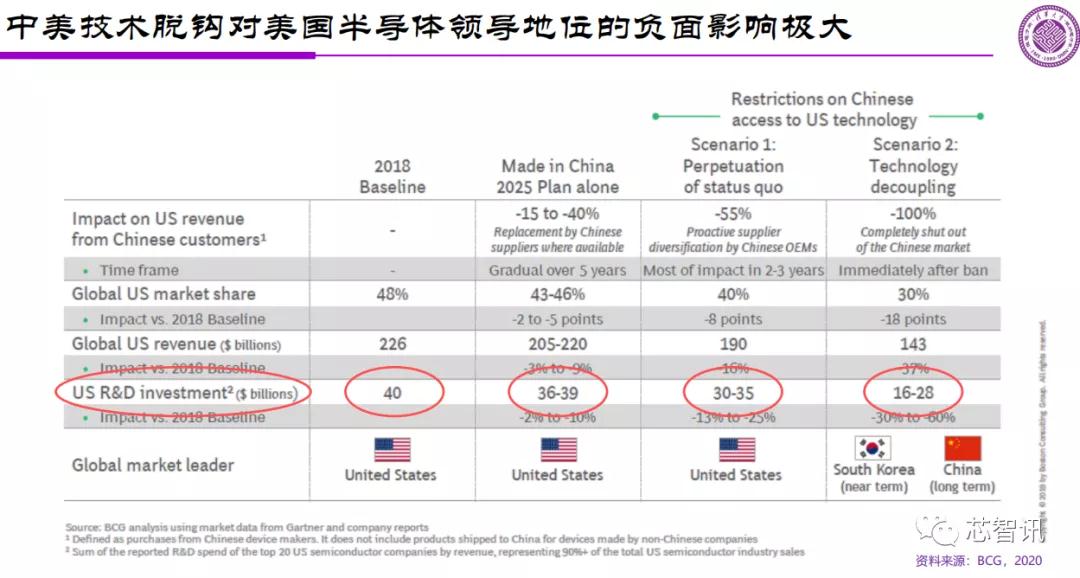 根據(jù)美國(guó)波士頓咨詢(xún)集團(tuán)給美國(guó)半導(dǎo)體行業(yè)協(xié)會(huì)做了一份報(bào)告顯示,在2018年美國(guó)沒(méi)有刻意在技術(shù)上限制中國(guó)之時(shí),美國(guó)半導(dǎo)體企業(yè)在全球的市場(chǎng)份額是48%,營(yíng)收高達(dá)2260億美元,研發(fā)投入也達(dá)到了400億美元。但是,當(dāng)中美技術(shù)開(kāi)始逐步脫鉤之后,僅根據(jù)中國(guó)2025的計(jì)劃,中國(guó)將15-40%的美國(guó)供應(yīng)商替換掉,那么美國(guó)半導(dǎo)體企業(yè)在全球市場(chǎng)的營(yíng)收將減少到2050-2200億美元,市場(chǎng)份額將降至43-46%,由于營(yíng)收的減少,也將使得美國(guó)半導(dǎo)體企業(yè)的研發(fā)投入減少至360-390億元。如果中美100%的技術(shù)脫鉤,那么屆時(shí)美國(guó)半導(dǎo)體企業(yè)的全球營(yíng)收將進(jìn)一步降至1430億美元,市場(chǎng)份額降至30%,研發(fā)投入也將降至160-280億美元。美國(guó)半導(dǎo)體的領(lǐng)導(dǎo)地位將被大大削弱,被韓國(guó)半導(dǎo)體產(chǎn)業(yè)所趕超,從長(zhǎng)遠(yuǎn)看可能還將會(huì)被中國(guó)所趕超。
