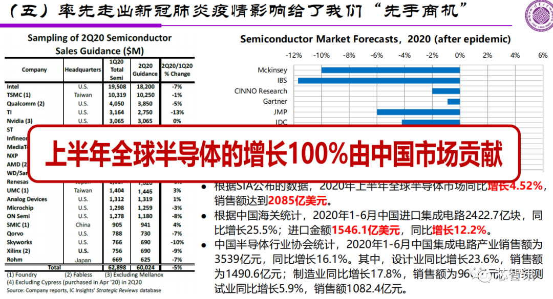 前面提到,受新冠疫情的影響,很多研究機(jī)構(gòu)預(yù)測(cè)2020年全球半導(dǎo)體市場(chǎng)將出現(xiàn)同比下滑。但是,根據(jù)研究機(jī)構(gòu)的預(yù)測(cè)數(shù)據(jù)顯示,2020年上半年,全球半導(dǎo)體市場(chǎng)同比增長(zhǎng)了4.52%,而根據(jù)中國(guó)的海關(guān)數(shù)據(jù)顯示,2020年上半年中國(guó)集成電路進(jìn)口額同比大幅增長(zhǎng)了12.2%。根據(jù)中國(guó)在全球半導(dǎo)體市場(chǎng)的占比來(lái)倒推,2020年全球半導(dǎo)體市場(chǎng)的增長(zhǎng),幾乎100%是由中國(guó)市場(chǎng)貢獻(xiàn)的。