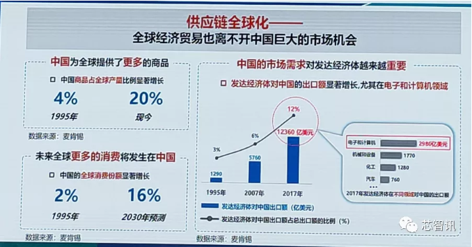 根據(jù)麥肯錫的數(shù)據(jù)顯示,中國(guó)商品占全球產(chǎn)量比例已從1995的4%,快速增長(zhǎng)到了目前的20%。這體現(xiàn)了中國(guó)制造的力量。而隨著中國(guó)內(nèi)需的持續(xù)擴(kuò)大,未來(lái)全球更多的消費(fèi)將發(fā)生在中國(guó),中國(guó)市場(chǎng)的地位將變得越來(lái)越重要。麥肯錫預(yù)測(cè)到2030年中國(guó)在全球消費(fèi)市場(chǎng)當(dāng)中的占比將達(dá)到16%。在此背景之下,發(fā)達(dá)國(guó)家對(duì)于中國(guó)的出口額也在顯著增長(zhǎng),特別是在電子和計(jì)算機(jī)領(lǐng)域。