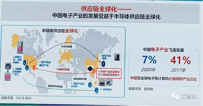 過(guò)去,中國(guó)也一直是全球化的[敏感詞]受益者之一,中國(guó)電子產(chǎn)業(yè)的高速發(fā)展正是受益于半導(dǎo)體供應(yīng)鏈的全球化。2000年之時(shí),中國(guó)電子產(chǎn)業(yè)在全球價(jià)值鏈當(dāng)中的占比僅7%,而到了2017年這一比例已猛增至41%。