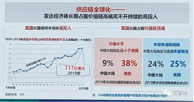 雖然2019年中國(guó)大陸對(duì)于半導(dǎo)體的消耗規(guī)模已經(jīng)與美國(guó)相當(dāng),但是在全球半導(dǎo)體價(jià)值鏈貢獻(xiàn)占比當(dāng)中,中國(guó)大陸仍只有9%,而美國(guó)則高達(dá)38%。