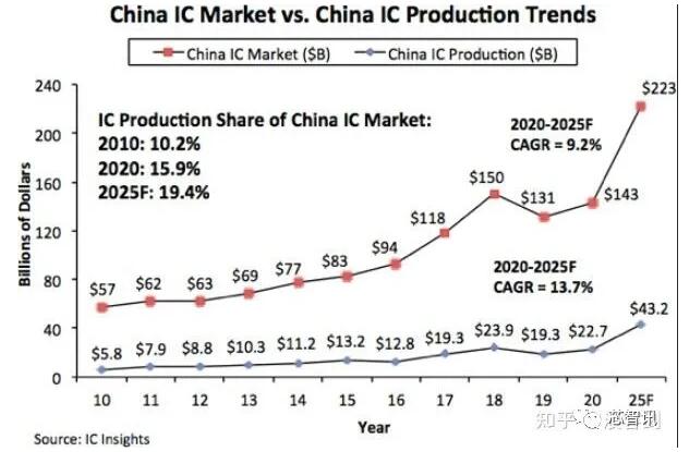 2020年8月,國(guó)務(wù)院印發(fā)了《新時(shí)期促進(jìn)集成電路產(chǎn)業(yè)和軟件產(chǎn)業(yè)高質(zhì)量發(fā)展的若干政策》,明確指出中國(guó)芯片自給率要在2025年達(dá)到70%。顯然,這與IC Insights的預(yù)測(cè)的中國(guó)大陸2025年不到20%的芯片自給率有著很大的差距。