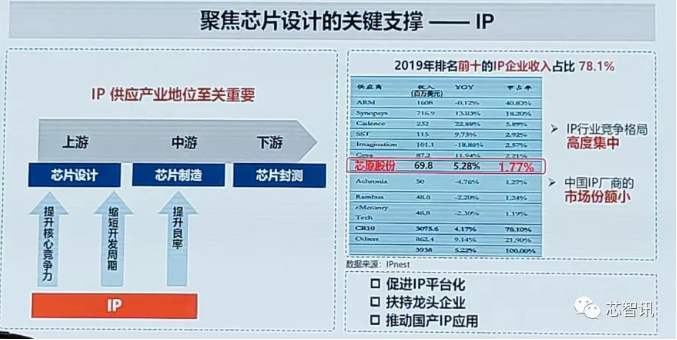 除了EDA之外,時(shí)龍興教授認(rèn)為另一個(gè)需要聚焦核心設(shè)計(jì)環(huán)節(jié),就是芯片設(shè)計(jì)所需的關(guān)鍵IP,它是提高芯片產(chǎn)品的競(jìng)爭(zhēng)力,縮短開(kāi)發(fā)周期,提升良率的關(guān)鍵環(huán)節(jié)。目前全球的十大的IP廠商當(dāng)中,國(guó)內(nèi)僅芯原股份進(jìn)入了前十,但是份額僅不到2%。時(shí)龍興教授表示,國(guó)內(nèi)需要促進(jìn)IP的平臺(tái)化,扶持龍頭企業(yè)推進(jìn)國(guó)產(chǎn)IP的發(fā)展。