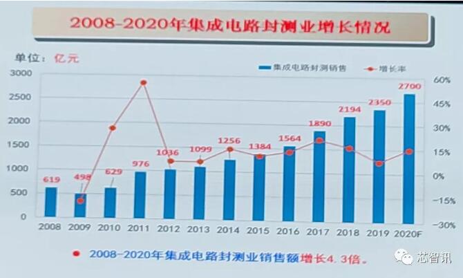 在國(guó)內(nèi)集成電路封測(cè)也方面,2008年至2020年間也保持了持續(xù)的穩(wěn)定的增長(zhǎng),銷(xiāo)售額由2008年的619億元猛增至2020年的2700億元,累計(jì)實(shí)現(xiàn)了4.3倍的增長(zhǎng)。