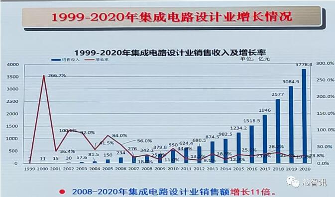 根據(jù)葉甜春教授在會(huì)上公布的數(shù)據(jù)顯示,1999-2020年的20年間,國(guó)內(nèi)集成電路設(shè)計(jì)業(yè)實(shí)現(xiàn)了持續(xù)的高速的增長(zhǎng),產(chǎn)值由1999年的3億元到2020年已猛增至3778.4億元。2008年至2020年中國(guó)集成電路設(shè)計(jì)產(chǎn)業(yè)銷(xiāo)售額已增長(zhǎng)了11倍,平均每年都保持了兩位數(shù)以上的增長(zhǎng)率。