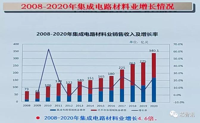 在集成電路材料產(chǎn)業(yè)方面,2020年國(guó)內(nèi)集成電路材料產(chǎn)業(yè)銷(xiāo)售規(guī)模為340.1億元,相比2008年增長(zhǎng)了超過(guò)4.6倍。