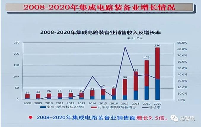 在國(guó)內(nèi)集成電路裝備產(chǎn)業(yè)方面,2008-2020年也實(shí)現(xiàn)了高速的增長(zhǎng),12年間銷(xiāo)售額累計(jì)增長(zhǎng)了9.5倍。特別是自2017年開(kāi)始,泛半導(dǎo)體領(lǐng)域裝備裝備業(yè)銷(xiāo)售額出現(xiàn)了猛增,而隨著2018年中興事件的發(fā)生,以及2019年華為被禁,國(guó)內(nèi)集成電路領(lǐng)域的裝備銷(xiāo)售額才開(kāi)始出現(xiàn)了更為明顯的增長(zhǎng)。