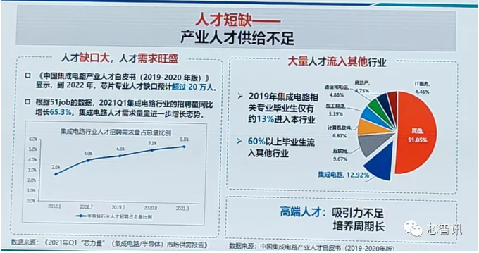 國(guó)內(nèi)招聘網(wǎng)站51job的數(shù)據(jù)也顯示,2021年Q1集成電路行業(yè)招聘量同比增長(zhǎng)了65.3%,集成電路人才需求量呈現(xiàn)高速增長(zhǎng)的態(tài)勢(shì)。